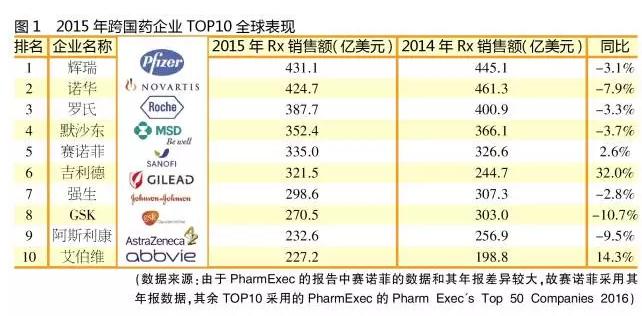 2015年全球医药企业TOP 10 七跌三涨